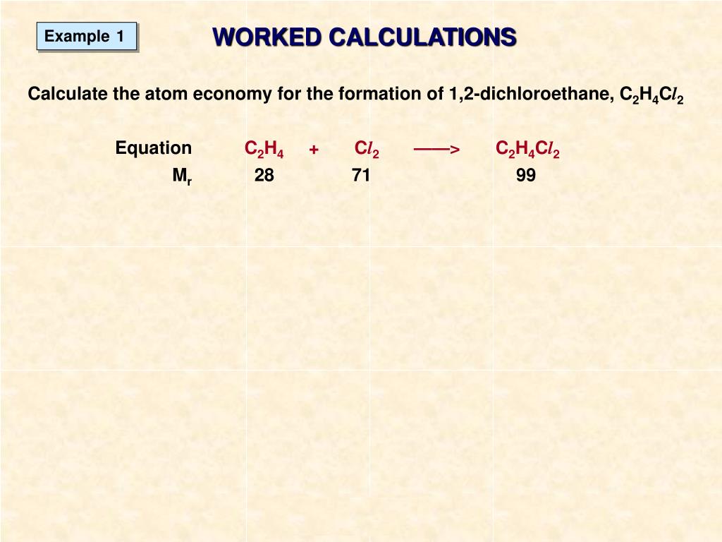 Atom economy = \(\frac{total~m_{r}~of~the~desired~product}{total~m_{r}~of~all~reactants} \times 100\) atom economy = \(\frac{2 \times 46}{180} \times 100\) atom economy = 51.1% (to 3 significant. Atom economy = \(\frac{total~m_{r}~of~the~desired~product}{total~m_{r}~of~all~reactants} \times 100\) atom economy = \(\frac{2 \times 46}{180} \times 100\) atom economy = 51.1% (to 3 significant. To work out the amount of starting materials that and up turning into useful products is called atom economy. % of atom economy = mr of useful products x100 total mr of all products Mass of desired useful product.. % of atom economy = mr of useful products x100 total mr of all products